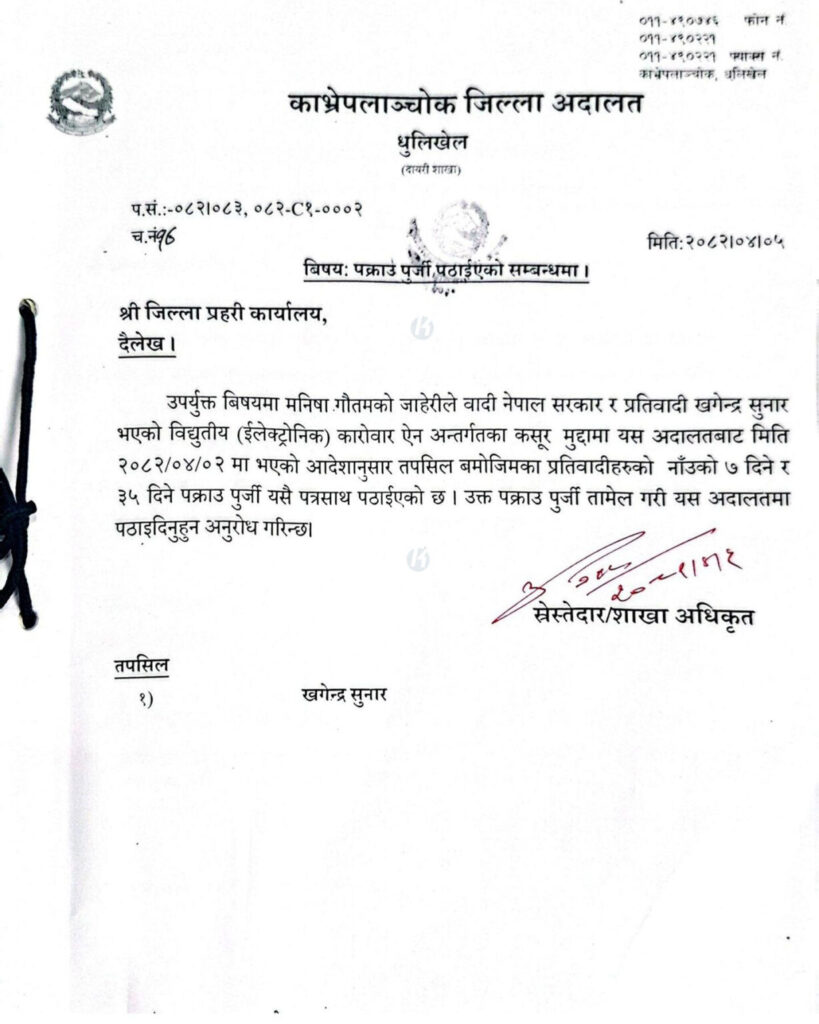 अदालतको दायरी शाखाबाट २०८२ साउन ५ गते जारी पत्रअनुसार अधिवक्ता मनिषा गौतमको जाहेरीका आधारमा नेपाल सरकार वादी र खगेन्द्र सुनार प्रतिवादी रहने गरी पनि मुद्दा दर्ता भएको थियो ।