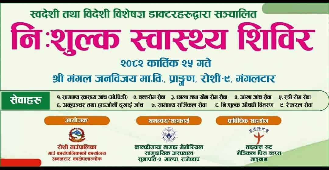 रोशी गाउँपालिका वडा नम्बर ९ मंगलटारमा निःशुल्क स्वास्थ्य शिविर आयोजना हुने भएको छ। रोशी गाउँपालिकाको आयोजना, कान्छीमाया तामाङ मेमोरियल सामुदायिक अस्पताल, सुनापाती –२, गाल्पा, रामेछापको सहकार्यमा र ताइवान रूट मेडिकल पिस क्रप्स, ताइवानको प्राविधिक सहयोगमा यही कार्तिक २५ गते श्री मंगल जनविजय माध्यमिक विद्यालयको प्राङ्गणमा शिविर सञ्चालन हुने भएको हो।