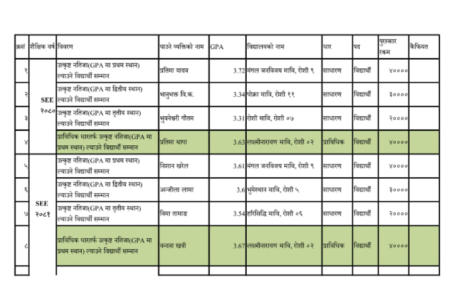 त्यसैगरि रोशी–६ हरिसिद्धि मावि का बिद्यार्थी निमा तामाङ (३.५४ जिपिए) ले तेस्रो स्थान प्राप्त गर्नुभएको छ। उहाँलाई नगद २० हजार रुपैयाँ र सम्मान पत्रद्वारा सम्मान गरिएको छ । प्राविधिक धारतर्फ रोशी–२ लक्ष्मीनारायण मावि कि छात्रा वन्दना खत्रीले ३.६७ जिपिए सहित प्रथम स्थान हासिल गर्नुभएको थियो । उहाँलाई नगद ४० हजार रुपैयाँ र सम्मान पत्रद्वारा सम्मान गरिएको छ ।