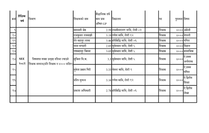 त्यसैगरी २०८१ को परिक्षामा विषयगत रूपमा उत्कृष्ट नतिजा दिलाउन सफल शिक्षकहरूलाई पनि नगद पुरस्कारसहित सम्मान गरिएको छ । सम्मानित हुने शिक्षकहरूमा लक्ष्मीनारायण मावि कि अंग्रेजी विषय शिक्षिका सरस्वती श्रेष्ठ,गणेश मावि का नेपाली विषय शिक्षक राजकुमार रायमाझी, हरिसिद्धि मावि का गणित विषय शिक्षक शेर बहादुर लामा, भुमेश्वर मावि का विज्ञान विषय शिक्षक मदन भण्डारी, भुमेश्वर मावि का सामाजिक विषय शिक्षक गणबहादुर जिम्वा रहेका छन् ।