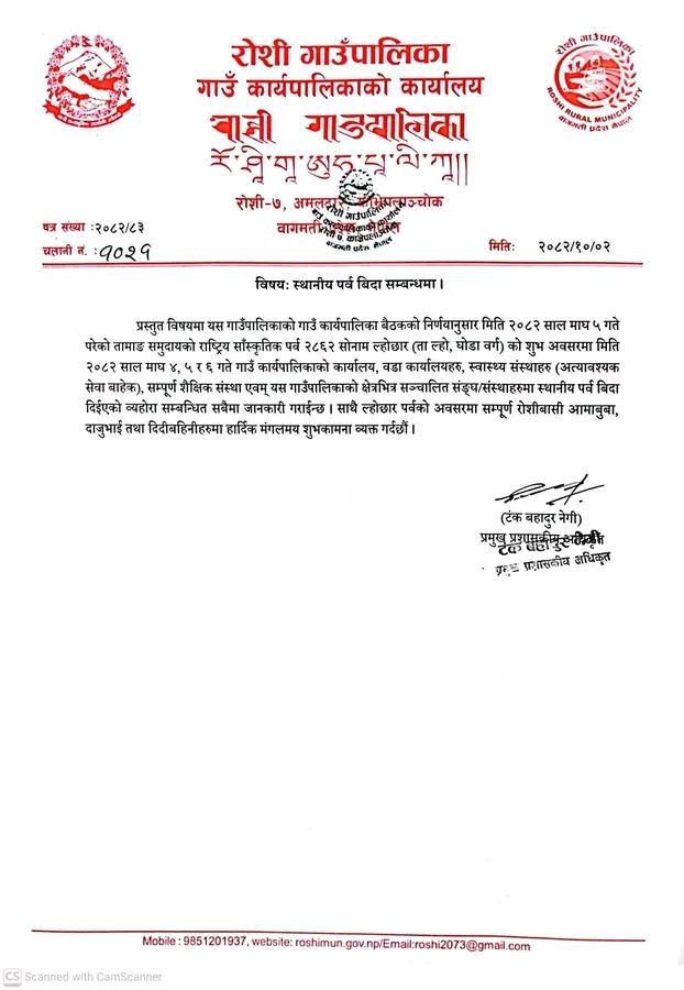 रोशी गाउँपालिकाले तामाङ समुदायको राष्ट्रिय सांस्कृतिक पर्व २८६२ सोनाम ल्होछार (ता ल्हो, घोडा वर्ग) को अवसरमा तीन दिन स्थानीय बिदा दिने निर्णय गरेको छ। गाउँ कार्यपालिकाको बैठकको निर्णयानुसार आज माघ ४ गतेदेखी ६ गतेसम्म पालिकाभर सार्वजनिक बिदा दिइएको हो । सूचना अनुसार गाउँ कार्यपालिकाको कार्यालय, सबै वडा कार्यालयहरू, स्वास्थ्य संस्थाहरू (अत्यावश्यक सेवा बाहेक), सबै शैक्षिक संस्थाहरू तथा पालिका क्षेत्रभित्र सञ्चालित विभिन्न संघ–संस्थाहरूमा बिदा दिइएको हो ।