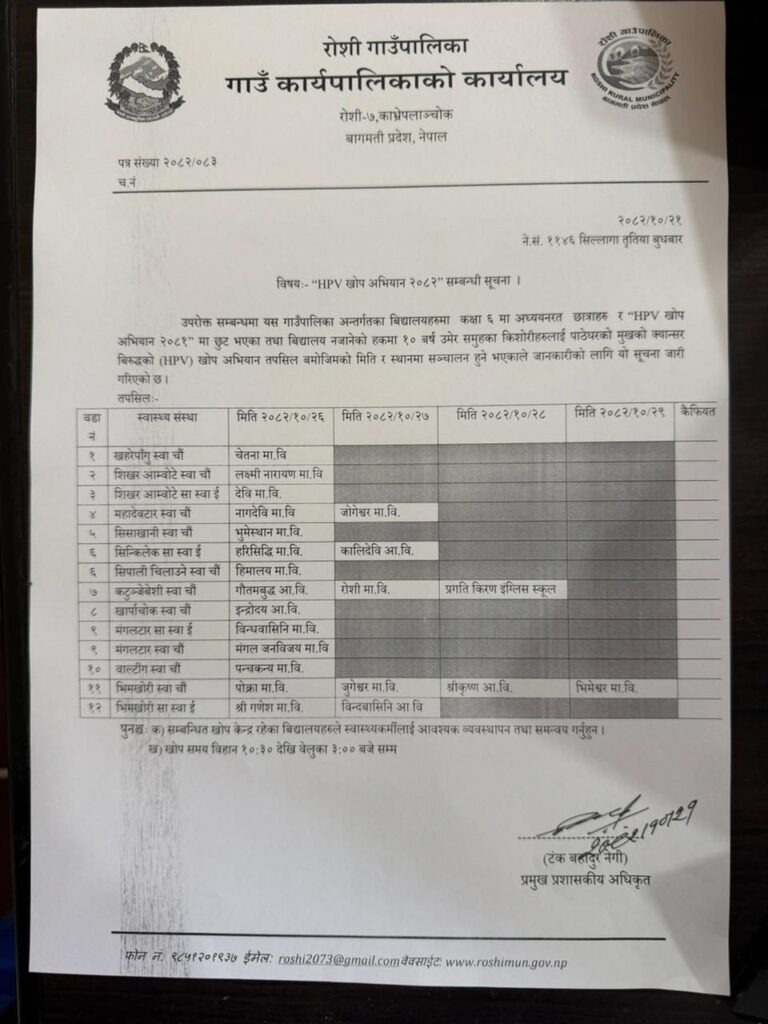 प्रमुख प्रशासकीय अधिकृत टंक बहादुर नेगीद्वारा हस्ताक्षरित सूचनामा, खोप केन्द्र तोकिएका विद्यालयहरूलाई स्वास्थ्यकर्मीहरूसँग आवश्यक समन्वय र व्यवस्थापन गर्न आग्रह गरिएको छ। पाठेघरको मुखको क्यान्सरको जोखिम न्यूनीकरण गर्न यो खोप अत्यन्त प्रभावकारी मानिने हुनाले आफ्ना बालबालिकालाई नजिकैको केन्द्रमा लगी खोप लगाउन गाउँपालिकाले सबै अभिभावकहरूमा अनुरोध गरेको छ।
