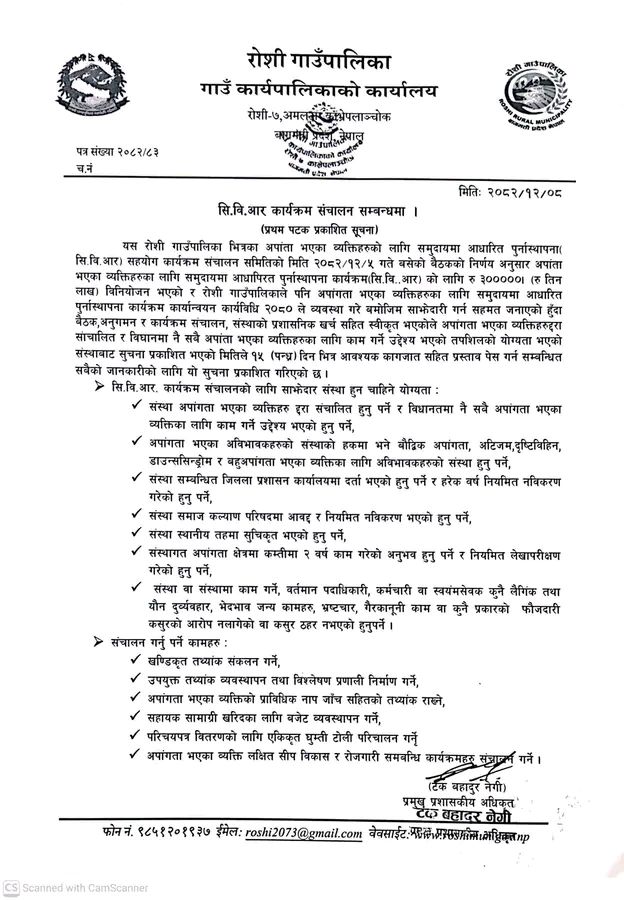 रोशी गाउँपालिकाले पालिकाभित्रका अपाङ्गता भएका व्यक्तिहरूको उत्थान र पुनःस्थापनाका लागि ‘समुदायमा आधारित पुनःस्थापना’ (सि.वि.आर) कार्यक्रम सञ्चालन गर्ने भएको छ । गाउँ कार्यपालिकाको कार्यालयले आज एक सूचना जारी गर्दै यस कार्यक्रममा साझेदारी गर्न इच्छुक र योग्य संस्थाहरूबाट प्रस्ताव आह्वान गरेको हो। मिति २०८२÷१२÷५ गते बसेको बैठकले उक्त कार्यक्रमका लागि रु. ३,००,००० (तीन लाख) रुपैया विनियोजन गर्ने निर्णय गरेको थियो। अपाङ्गता भएका व्यक्तिहरूद्वारानै सञ्चालित संस्थाहरूलाई प्राथमिकता दिँदै यो कार्यक्रम अघि बढाउन लागिएको हो।